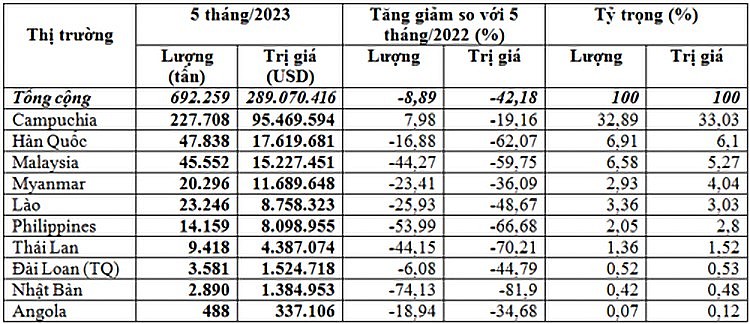 Phân bón của Việt Nam xuất khẩu chủ yếu sang thị trường Campuchia. Riêng thị trường này đã chiếm 33% trong tổng khối lượng và tổng kim ngạch xuất khẩu phân bón của cả nước, đạt 227.708 tấn, tương đương 95,47 triệu USD, giá trung bình 419,3 USD/tấn, tăng 8% về lượng nhưng giảm 19,2% kim ngạch và giá giảm 25,1% so với cùng kỳ năm 2022. Trong tháng 5/2023 xuất khẩu sang thị trường này đạt 76.236 tấn, tương đương 29,92 triệu USD, giá trung bình 392,5 USD/tấn, tăng 64,7% về lượng và tăng 65,4% kim ngạch, giá tăng nhẹ 0,4% so với tháng 4/2023.