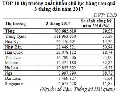 Dự kiến, năm 2017 xuất khẩu rau quả đạt 3 tỷ USD, tăng 25% so với năm 2016. Rau quả Việt Nam đã có mặt trên 60 quốc gia và vùng lãnh thổ. Trong Top 10 thị trường, Trung Quốc là thị trường chủ lực, chiếm tỷ trọng 73,1%, đứng thứ hai là Hoa Kỳ 3,54%, Nhật Bản 3,01%, Hàn Quốc 2,99%....