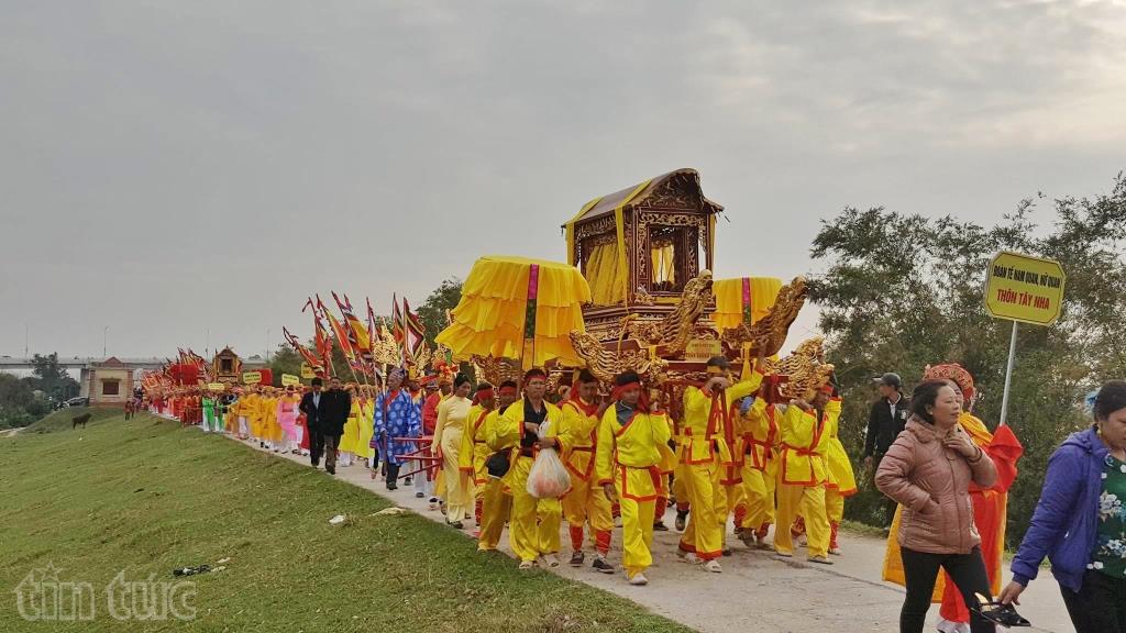 Trên vệ đê, dưới thuyền, dọc đường đi tới bến sông cờ lễ hội cắm rợp trời, chiêng trống vang lừng, nhân dân đứng chật hai bên đường xem lễ hội rước nước. Kiệu chum nước đi tới đâu, người dân hai bên lại xô lại như để mong được hưởng làn nước mát trong, sạch sẽ từ nguồn.