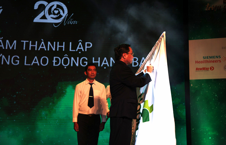 Ông Nguyễn Tấn Bỉnh, Giám đốc Sở Y tế TP. Hồ Chí Minh gắn Huân chương Lao động hạng Ba lên cờ truyền thống của Tập đoàn Y khoa Hoàn Mỹ