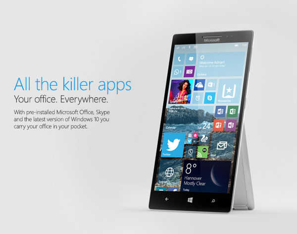 Concept Surface Phone có màn hình Full HD 5,7 inch. Máy chạy hệ điều hành Windows 10 và hướng đến nhu cầu văn phòng khi được cài sẵn bộ Microsoft Office, Skype.