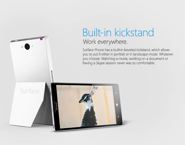 Điểm độc đáo trong ý tưởng điện thoại của Microsoft là phần nắp lưng cho phép mở ra thành chân đế. Người dùng có thể dựng Surface Phone theo cả chiều dọc hay chiều ngang. Thiết kế này hỗ trợ người dùng xem phim, làm việc hay trò chuyện Skype mà không cần cầm máy trên tay.