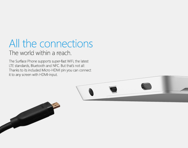 Về kết nối, ngoài các tiêu chuẩn phổ biến, Surface Phone được lên ý tưởng với cổng microHDMI, cho phép xuất tín hiệu hình ảnh, âm thanh từ thiết bị ra màn hình lớn.