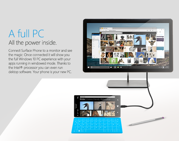 Lúc này, Surface Phone sẽ đóng vai trò của một chiếc máy tính dùng Windows 10 thực thụ. Người dùng có thể chạy các ứng dụng quen thuộc trên PC nhờ chip xử lý mạnh mẽ từ Intel.