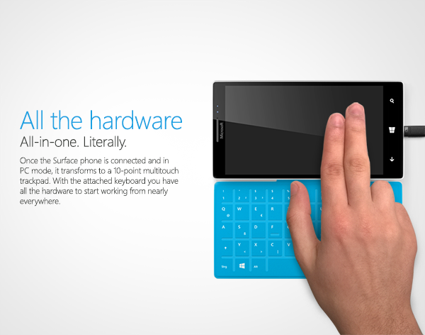 Tương tự Surface Pro, điện thoại của Microsoft cho phép nhập liệu tốc độ cao nhờ bàn phím gắn ngoài. Touch Cover có thiết kế mỏng giúp biến Surface Phone thành chiếc máy tính thu nhỏ, đồng thời đóng vai trò bảo vệ mặt màn hình thiết bị.