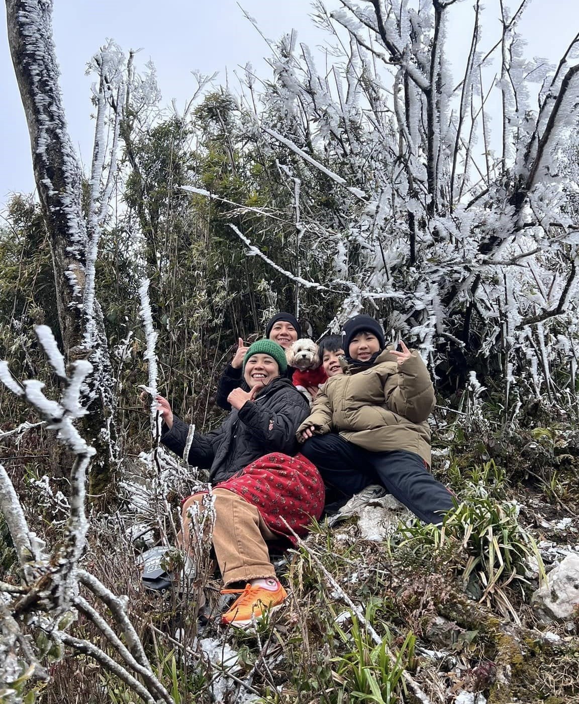 | Một người dân may mắn chụp ảnh cùng cảnh băng tuyết vào dịp cận Tết 2025. Ảnh: Vàng A Thào |