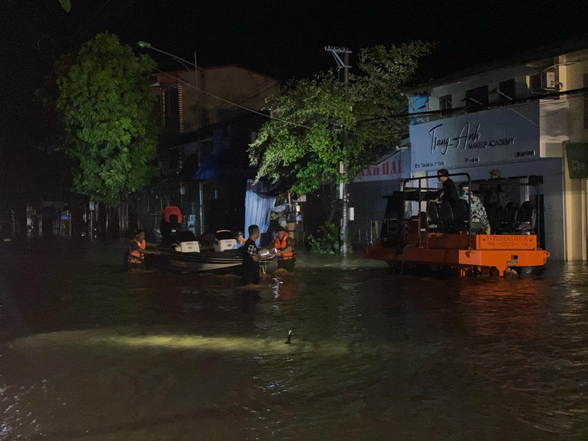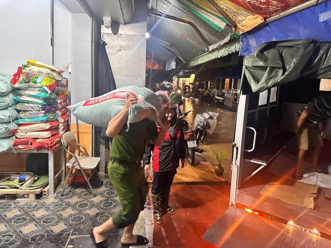 | Nước lũ dâng cao, hàng trăm cán bộ, chiến sĩ Công an nhân dân đã hỗ trợ người dân tại thành phố Yên Bái chạy lũ trong đêm (Ảnh: Yên Bái 24h). |