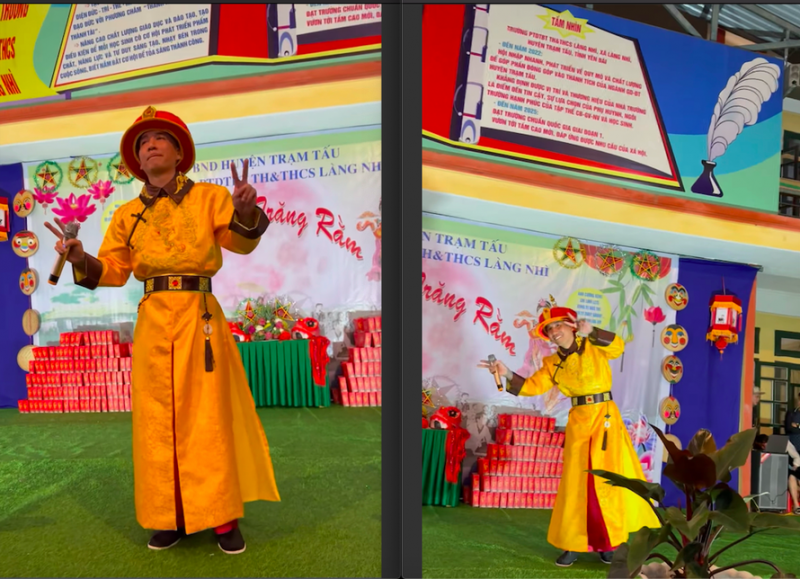 | Phú Lê ăn mặc như vua chúa nháy múa, hát hò trong chương trình Đêm hội trăng rằm tổ chức tại Trường Tiểu học và THCS Làng Nhì |