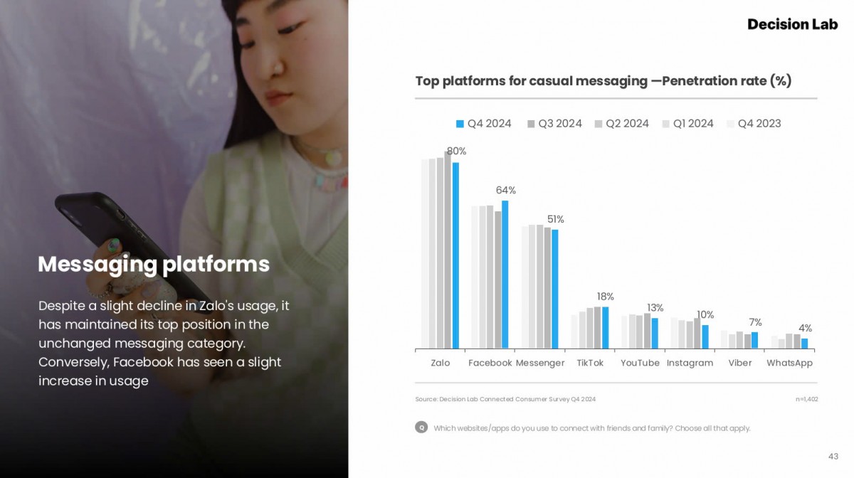 Cụ thể, ở hạng mục “Nền tảng nhắn tin” (Messaging platforms), trong quý IV/2024, Zalo dẫn đầu với tỷ lệ sử dụng (Penetration rate) đạt 80%, theo sau bởi Facebook với 64% và Messenger đạt 51%. Bảng xếp hạng này còn có sự xuất hiện của các nền tảng khác như TikTok (18%), Viber (7%), WhatsApp (4%).