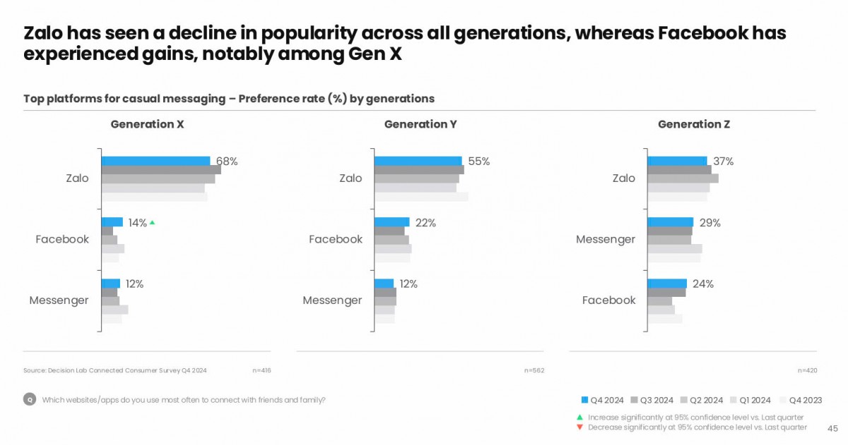 Zalo tiếp tục củng cố vị trí nền tảng được yêu thích nhất ở cả 3 nhóm thế hệ người dùng là Gen X, Gen Y và Gen Z. Ở nhóm Gen X (những người sinh từ năm 1965 đến 1980) có 68% số người được khảo sát cho biết họ sử dụng Zalo cho việc nhắn tin hàng ngày (casual messaging) trong khi tỷ lệ sử dụng với Facebook và Messenger chỉ đạt lần lượt là 14% và 12%.