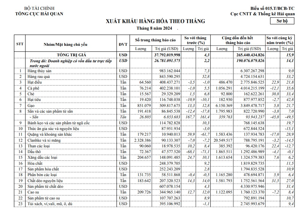 Theo số liệu của Tổng cục Hải quan, trong tháng 8, Việt Nam xuất khẩu 19.420 tấn hồ tiêu, đạt 116,7 triệu USD giảm 10,9% về lượng và 10,1% về trị giá so với tháng 7 năm 2024. Lũy kế, 8 tháng năm 2024, xuất khẩu hồ tiêu của Việt Nam đạt 182.930 tấn với trị giá gần 878 triệu USD, giảm 2,7% về lượng nhưng tăng 42,8% về trị giá so với cùng kỳ năm trước.
