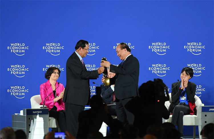 | Thủ tướng Campuchia Hun Sen, Thủ tướng Nguyễn Xuân Phúc, Thủ tướng CHDCND Lào Thongloun Sisoulith, Tổng thống Philippines Rodrigo Duterte tại phiên khai mạc toàn thể WEF-ASEAN |